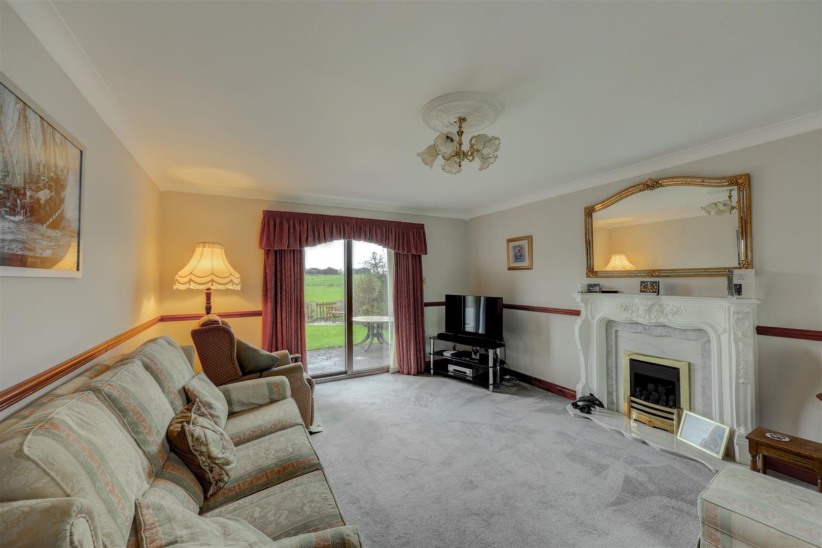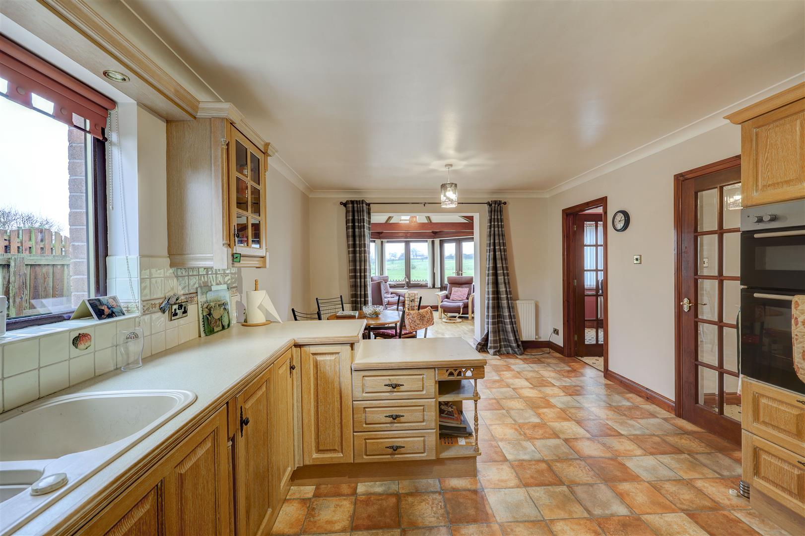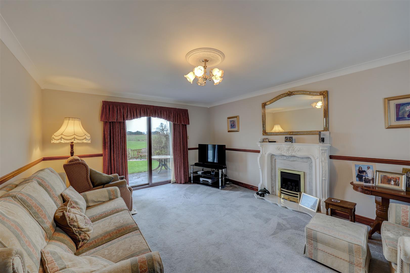 A welcoming entrance porch opens into a spacious central hallway with staircase leading to the first floor. The living room is a bright and comfortable space with dual aspect, including patio doors opening to the rear garden and taking full advantage of the open countryside views.