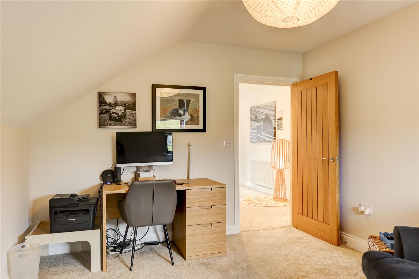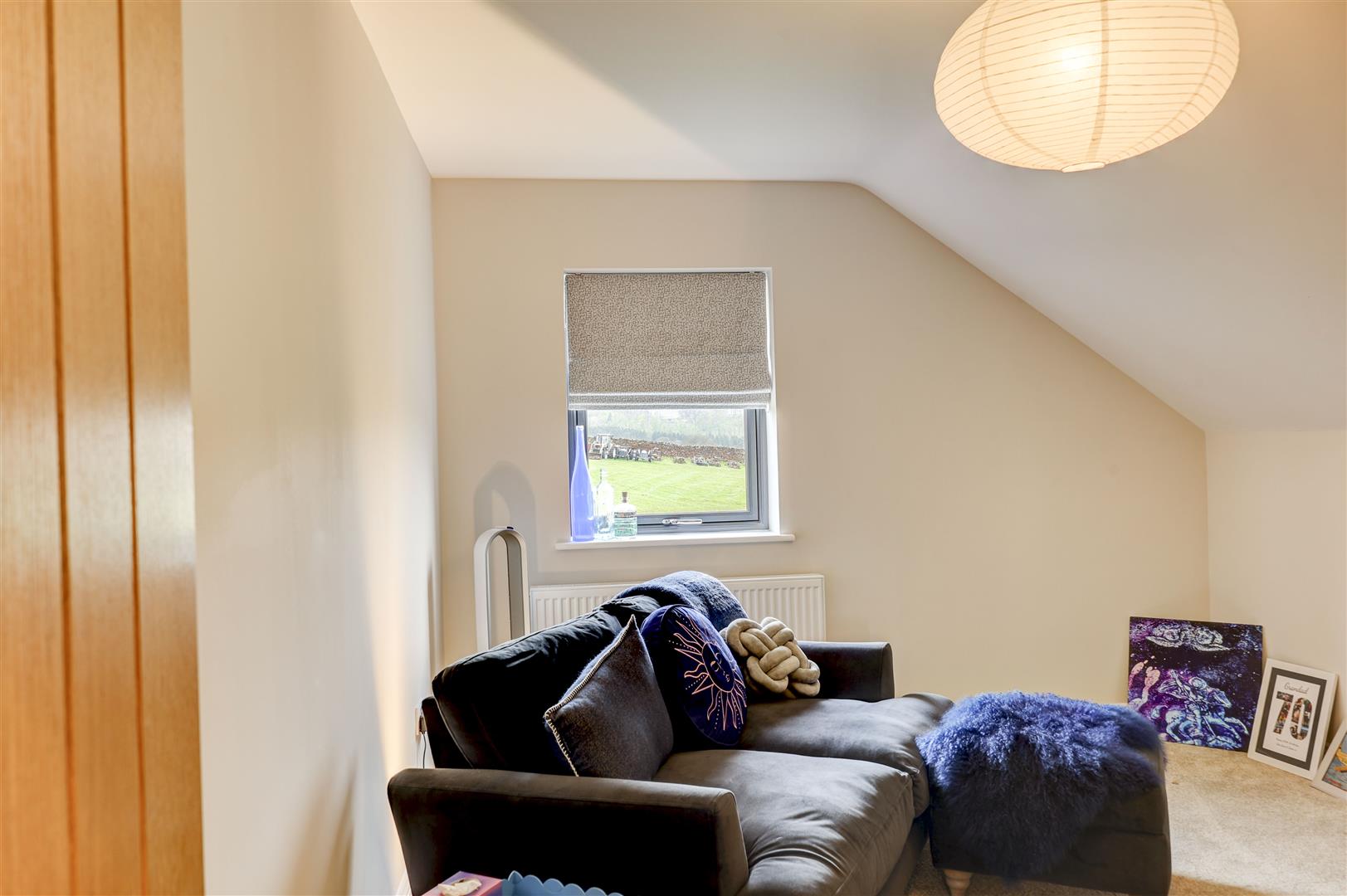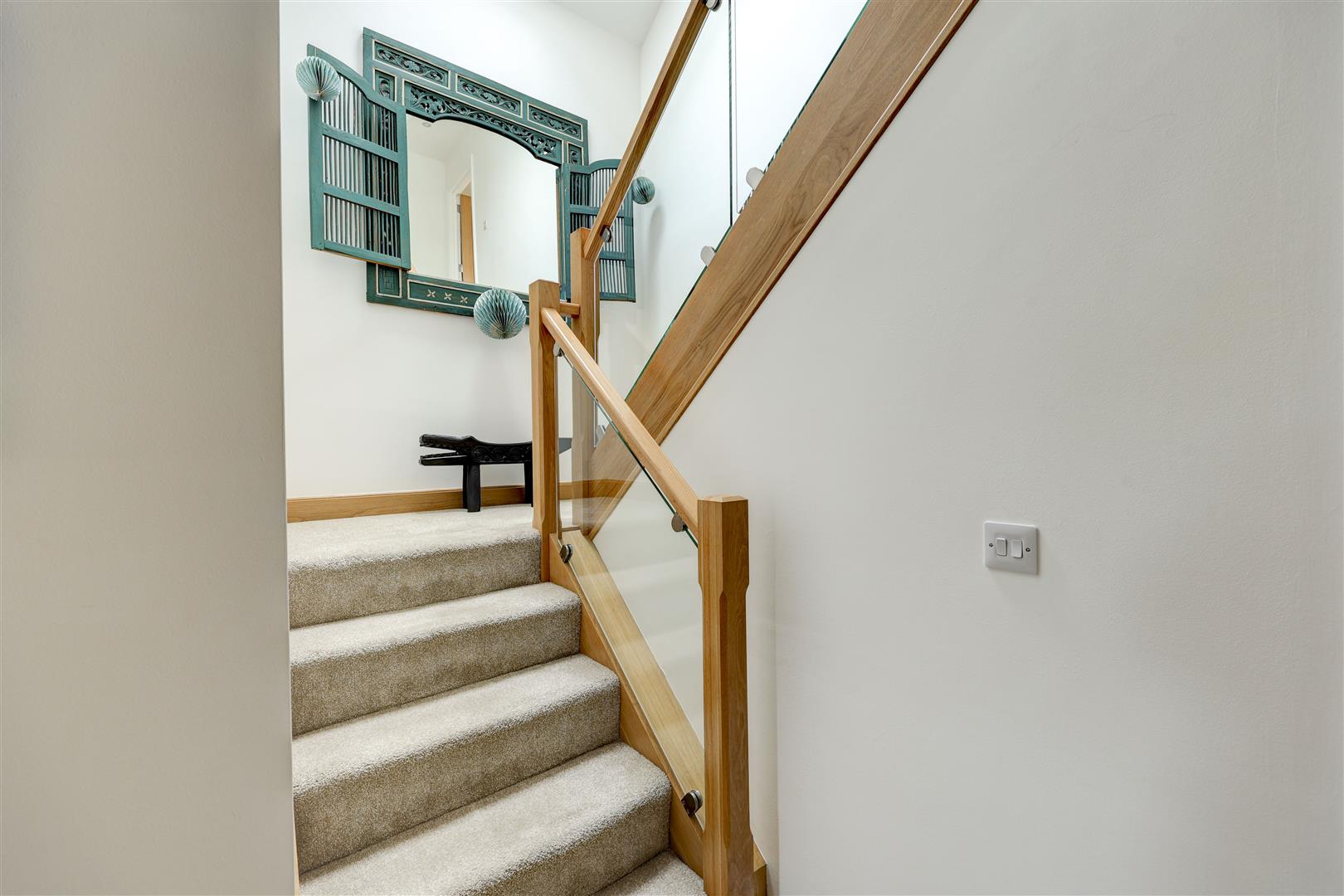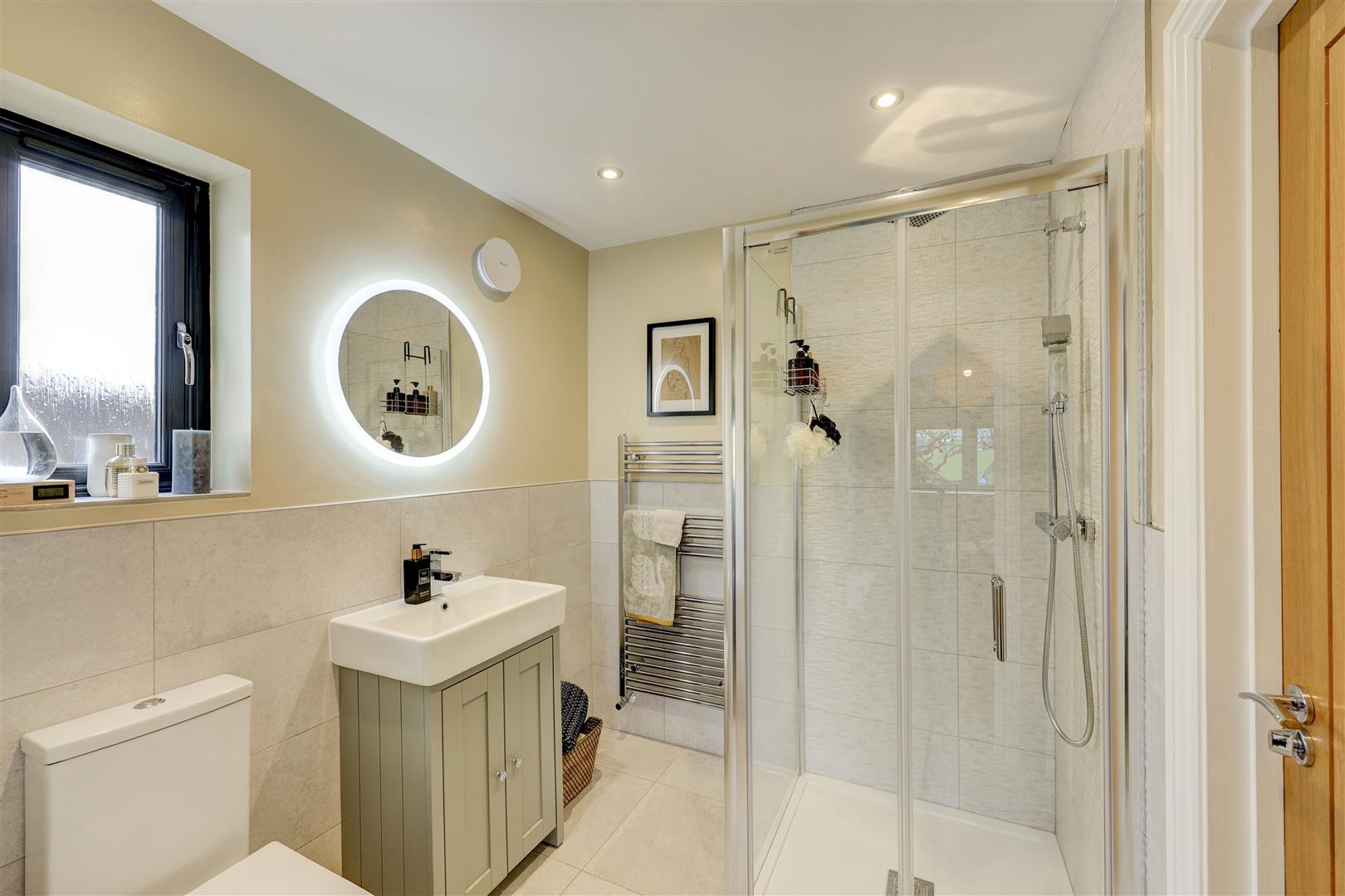 A welcoming landing with storage cupboard leads to the main living spaces. The dining kitchen is a standout feature, with modern integrated appliances, generous workspace, and French doors opening to the rear with countryside views, ideal for both everyday living and entertaining. Opposite, the bright living room benefits from multiple windows and a log burner, creating a warm and inviting space with distant Pennine views. This floor also includes a versatile double bedroom (currently used as an office) with fitted wardrobes and a Jack and Jill en-suite shower room.