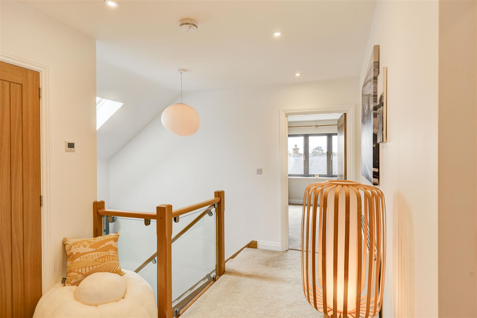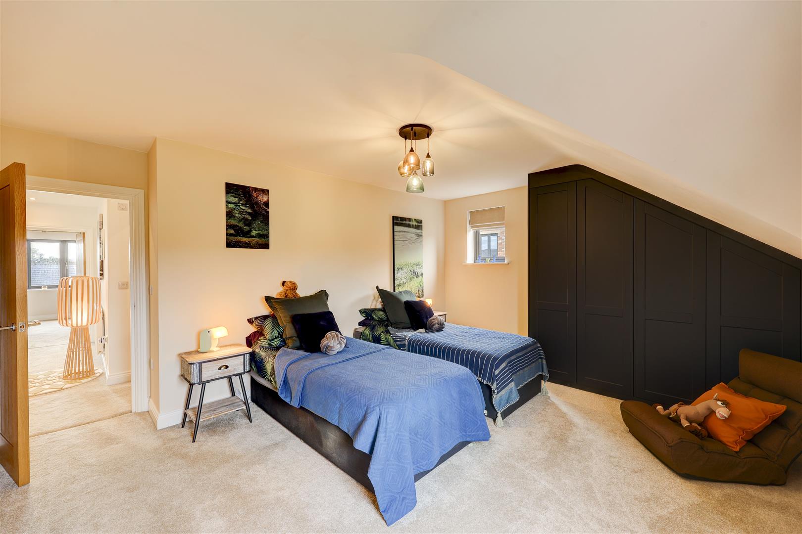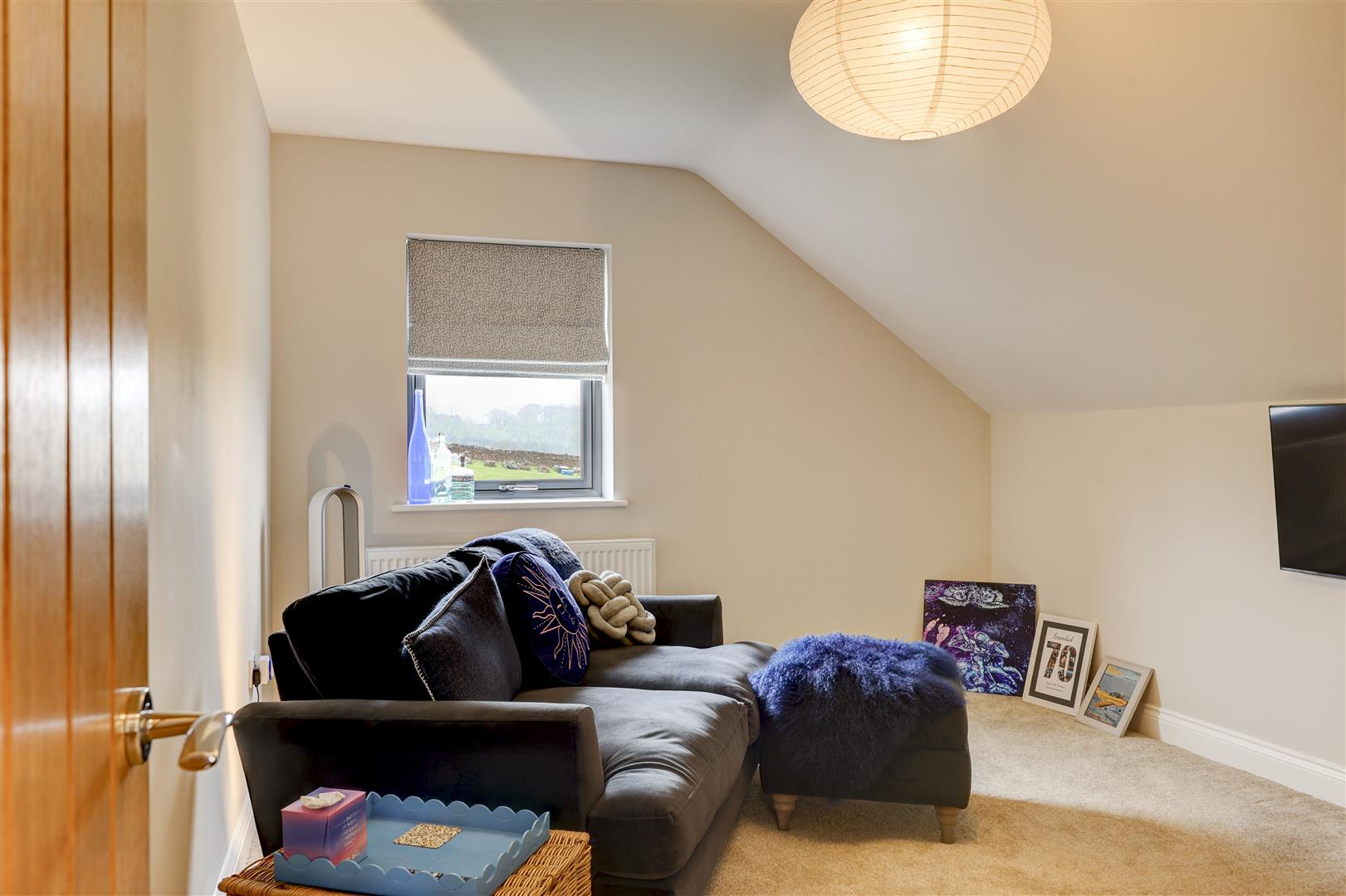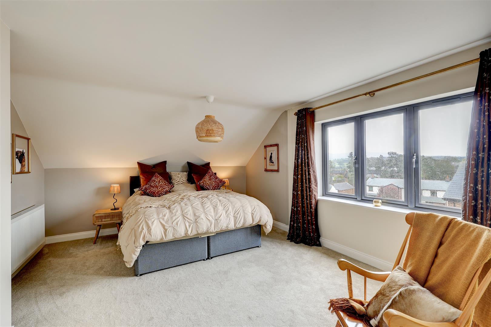 A welcoming landing with storage cupboard leads to the main living spaces. The dining kitchen is a standout feature, with modern integrated appliances, generous workspace, and French doors opening to the rear with countryside views, ideal for both everyday living and entertaining. Opposite, the bright living room benefits from multiple windows and a log burner, creating a warm and inviting space with distant Pennine views. This floor also includes a versatile double bedroom (currently used as an office) with fitted wardrobes and a Jack and Jill en-suite shower room.