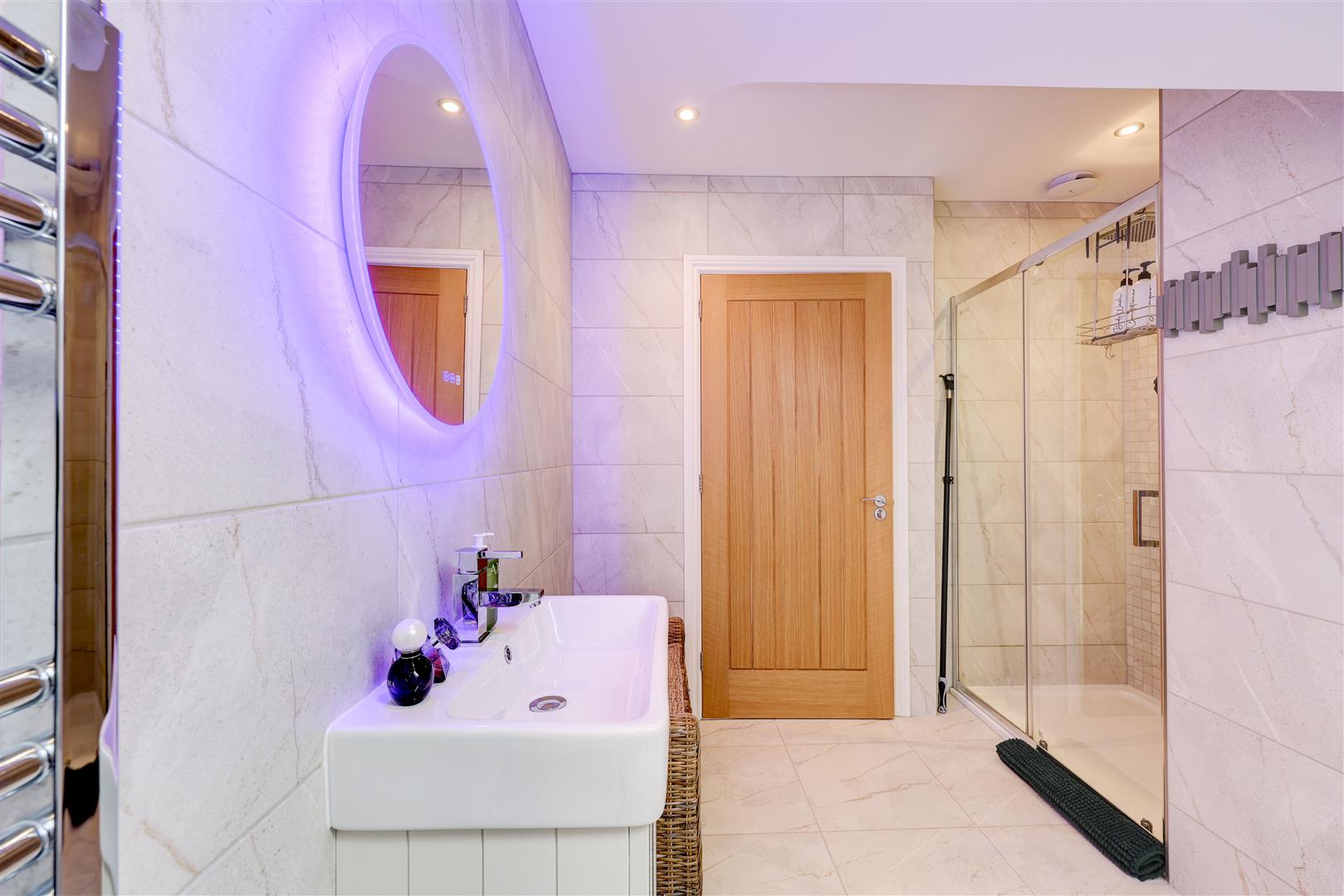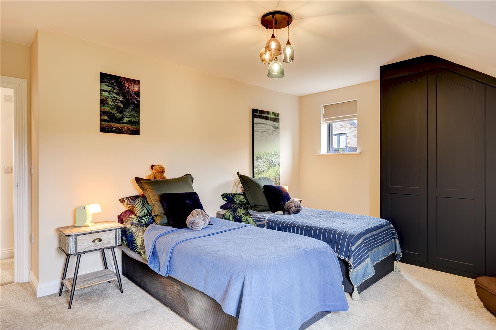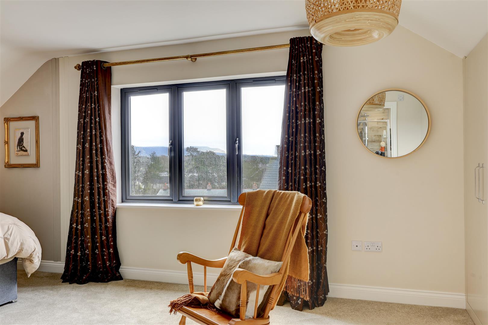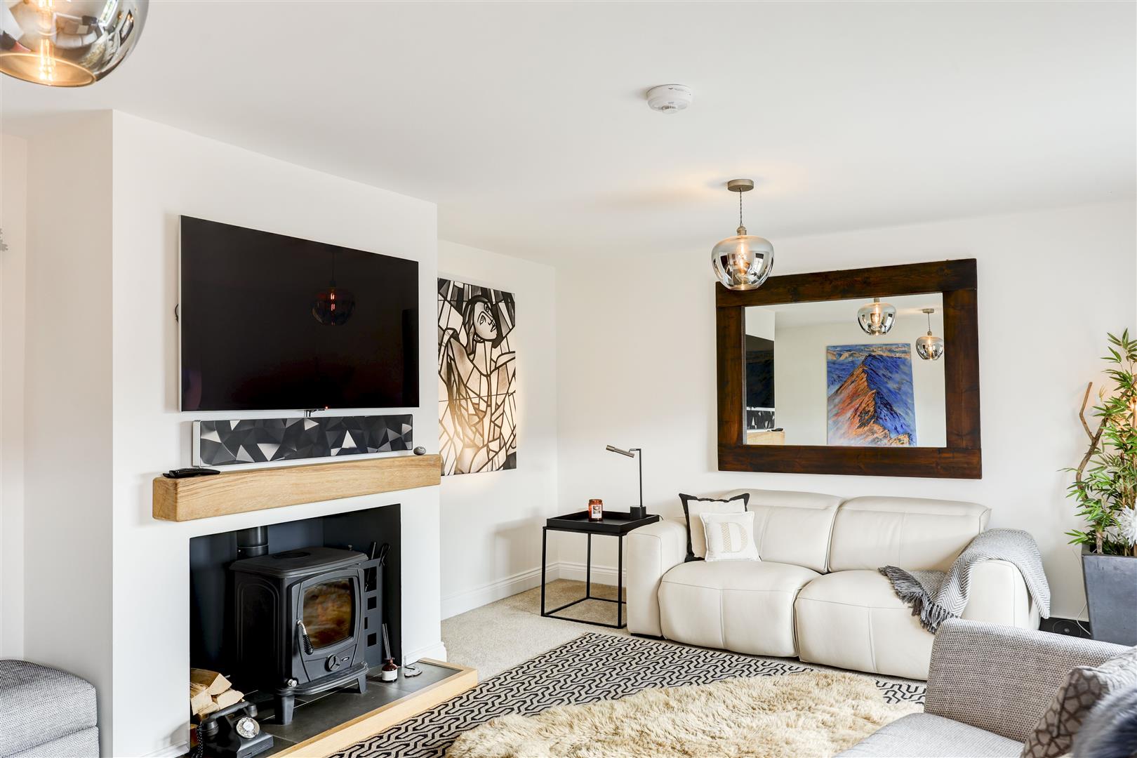A welcoming landing with storage cupboard leads to the main living spaces. The dining kitchen is a standout feature, with modern integrated appliances, generous workspace, and French doors opening to the rear with countryside views, ideal for both everyday living and entertaining. Opposite, the bright living room benefits from multiple windows and a log burner, creating a warm and inviting space with distant Pennine views. This floor also includes a versatile double bedroom (currently used as an office) with fitted wardrobes and a Jack and Jill en-suite shower room.