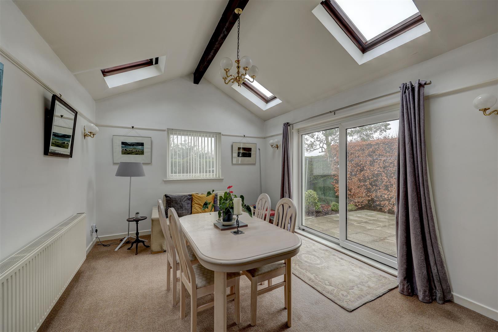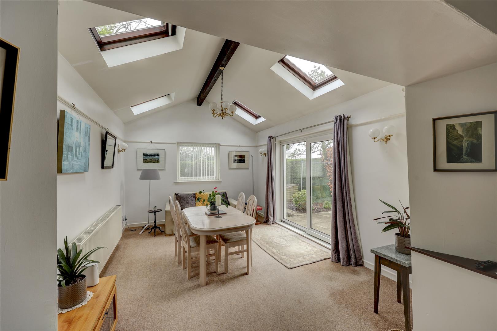 This is a wonderfully bright and airy dining space with windows to both front and rear, impressive part vaulted ceiling with roof windows bringing in plenty of natural light and patio doors which open onto the landscaped rear garden.