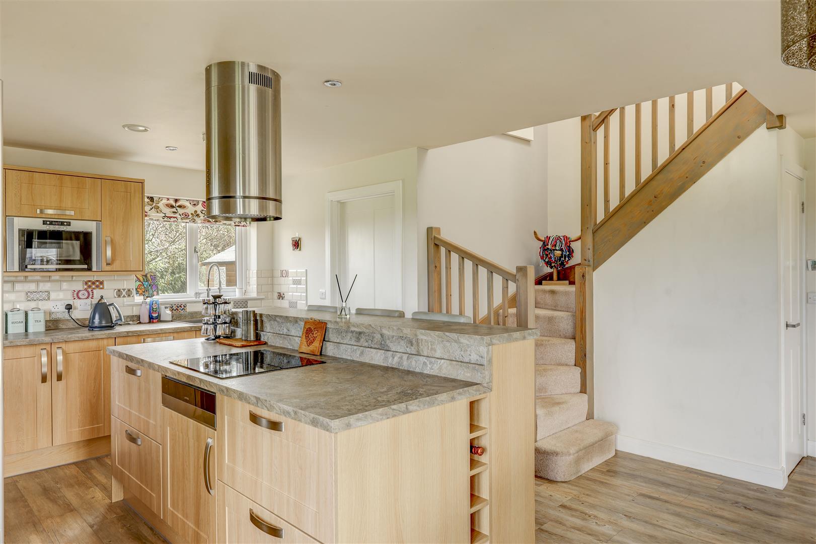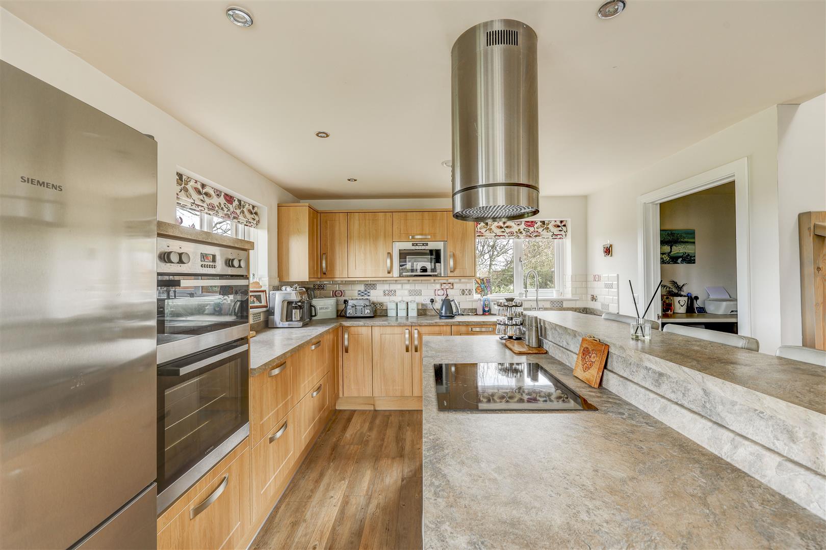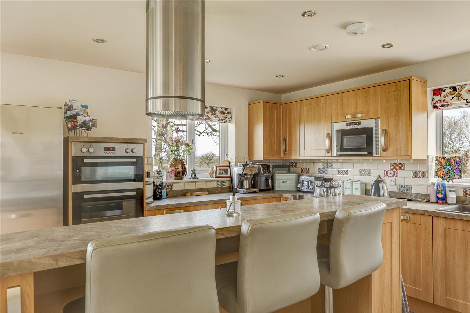 Kitchen: The modern kitchen has a range of fitted wall and base units with complementing worksurfaces, tiled splashbacks, a sink drainer unit and a large central island with breakfast bar, storage and wine rack. Integrated appliances include double oven, hob with extractor unit over, microwave and dishwasher. Karndene flooring. Two uPVC double glazed window units.