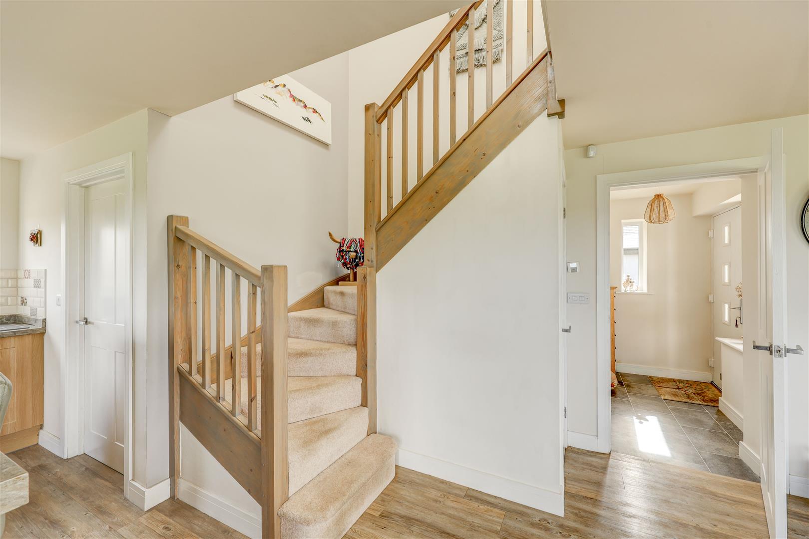 Lounge: The lounge is bright and spacious with floor to ceiling uPVC windows and sliding doors to the garden patio and French doors to the rear garden. There is Karndene flooring throughout and a wood burning stove set upon a tiled hearth. Stairs leading up to the first floor with an understairs storage cupboard.