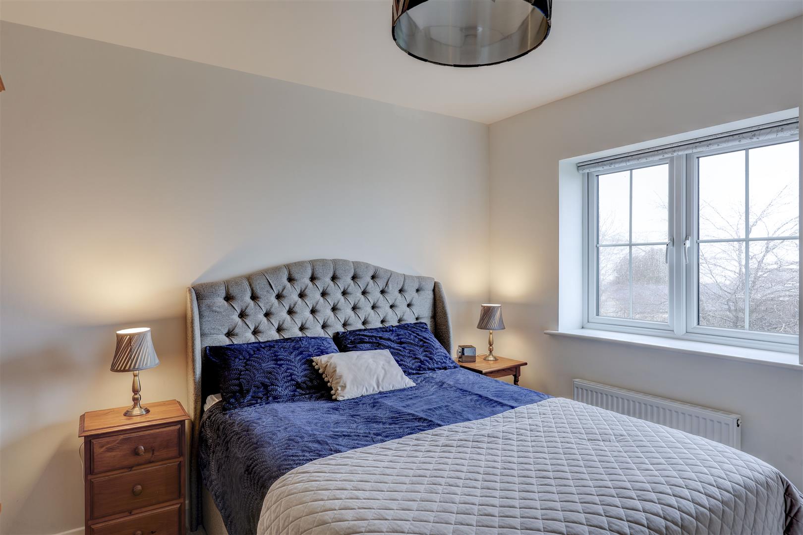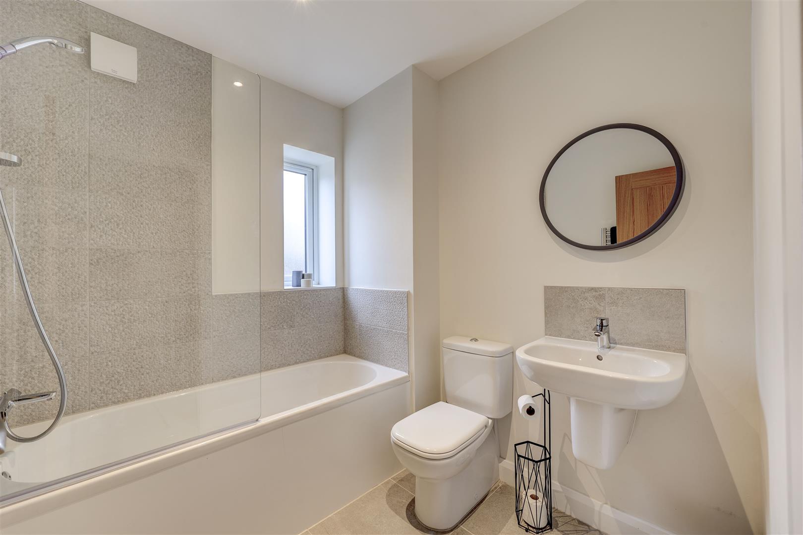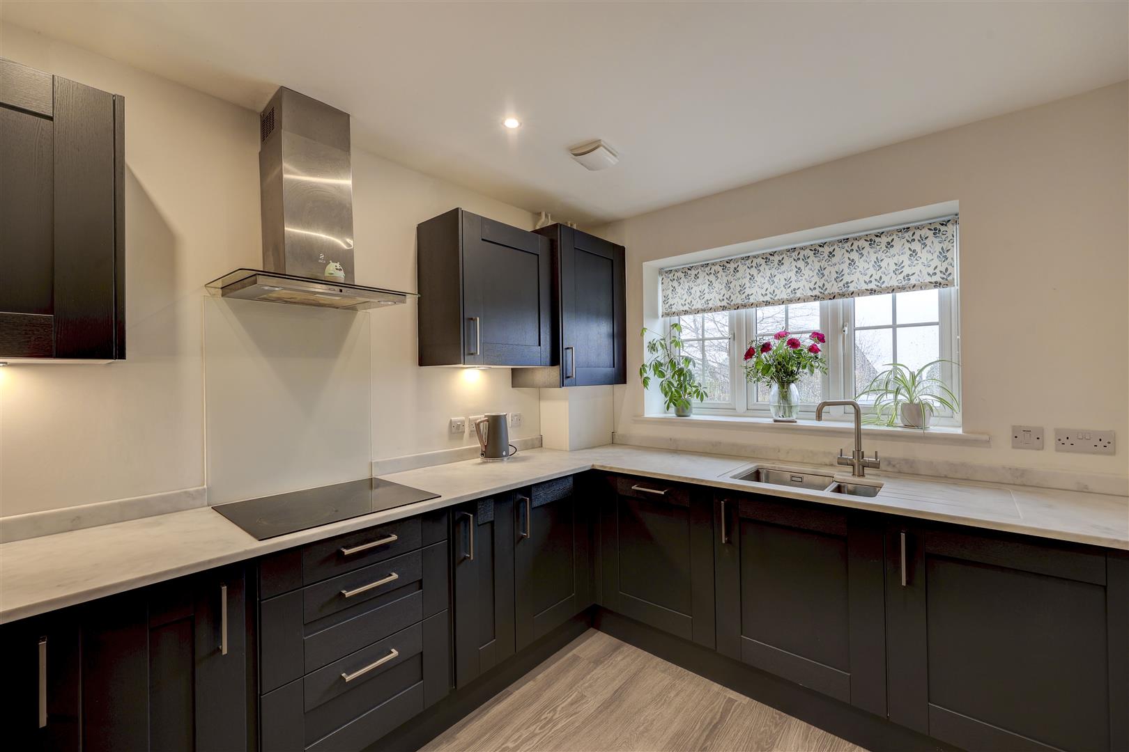 A beautifully appointed, modern kitchen suite which has a range of navy wall and base units with complementing worksurfaces and a sink unit. There are a range of integrated appliances including a fridge freezer, dishwasher, washer dryer, double oven, induction hob and extractor hood over. There is a uPVC double glazed window to the front aspect overlooking the green. Wooden flooring. Radiator.