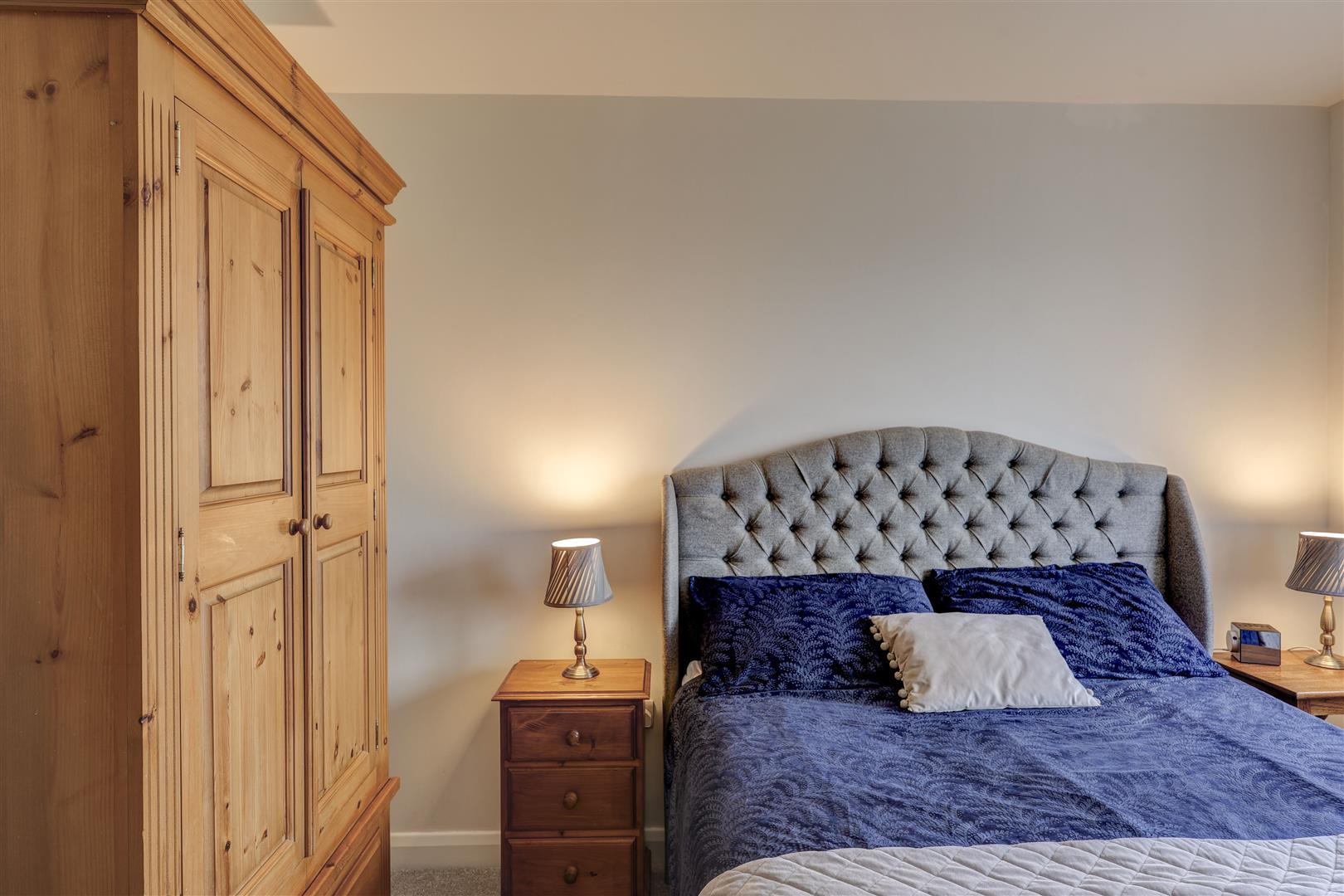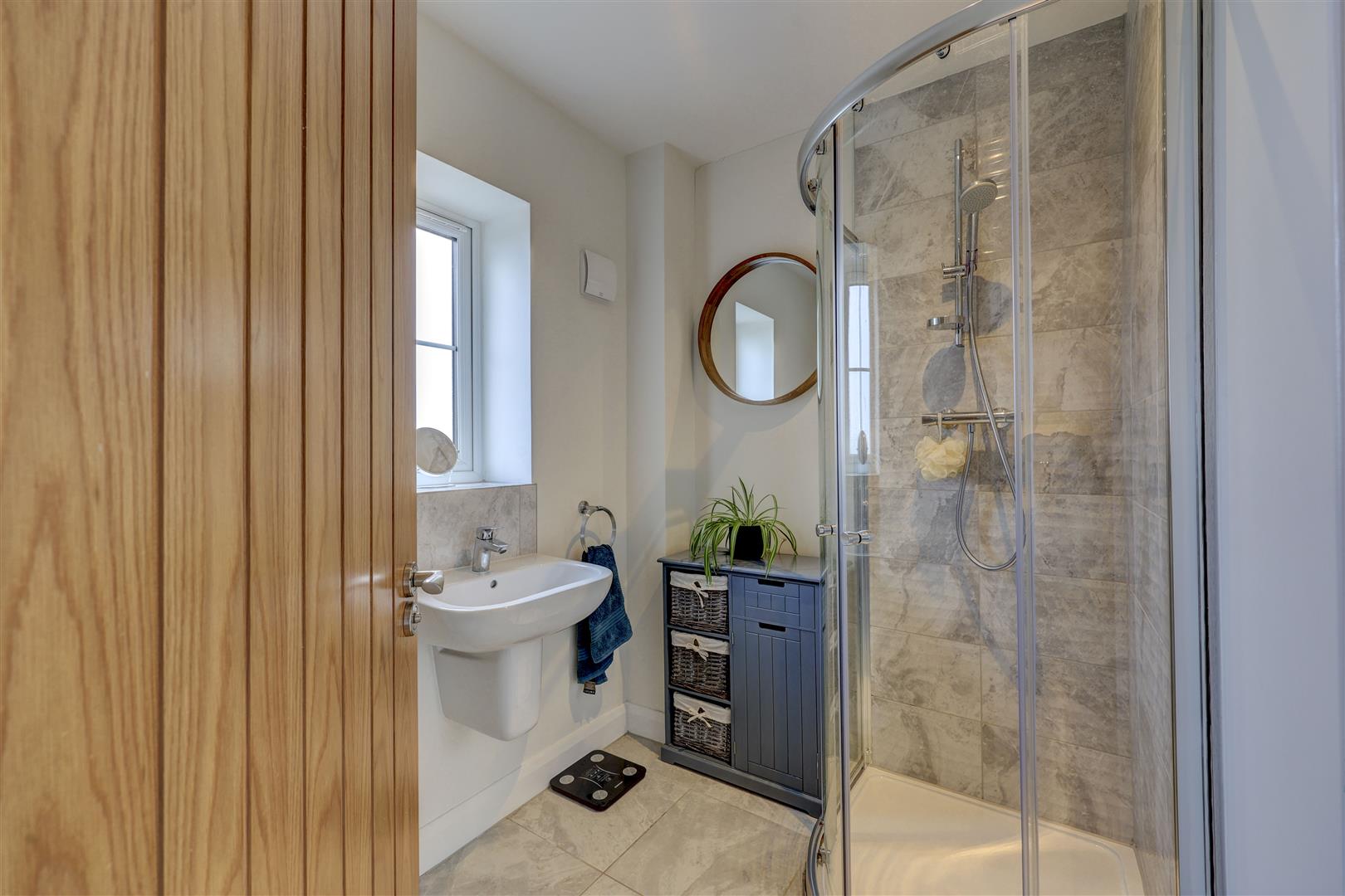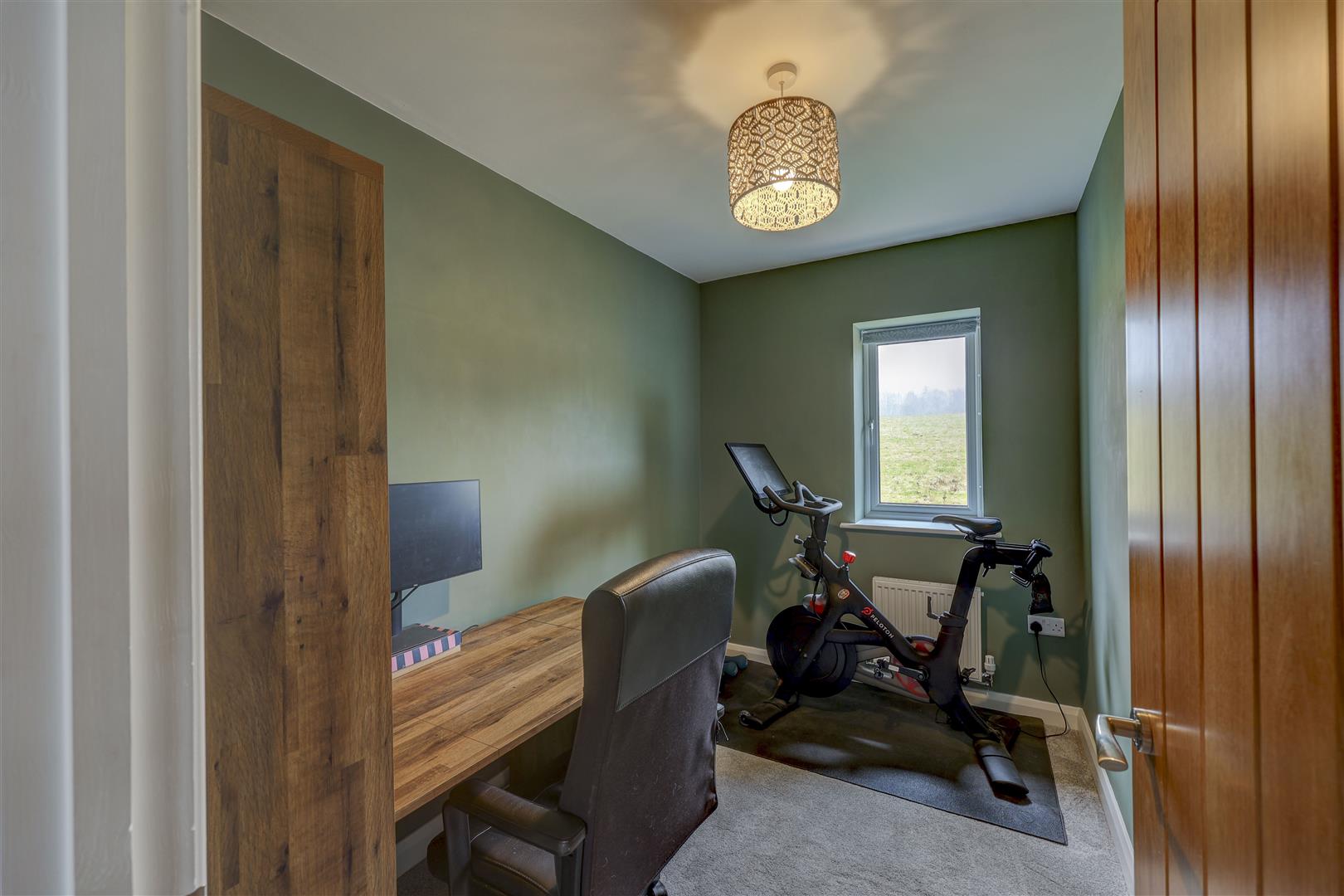 A beautifully appointed, modern kitchen suite which has a range of navy wall and base units with complementing worksurfaces and a sink unit. There are a range of integrated appliances including a fridge freezer, dishwasher, washer dryer, double oven, induction hob and extractor hood over. There is a uPVC double glazed window to the front aspect overlooking the green. Wooden flooring. Radiator.