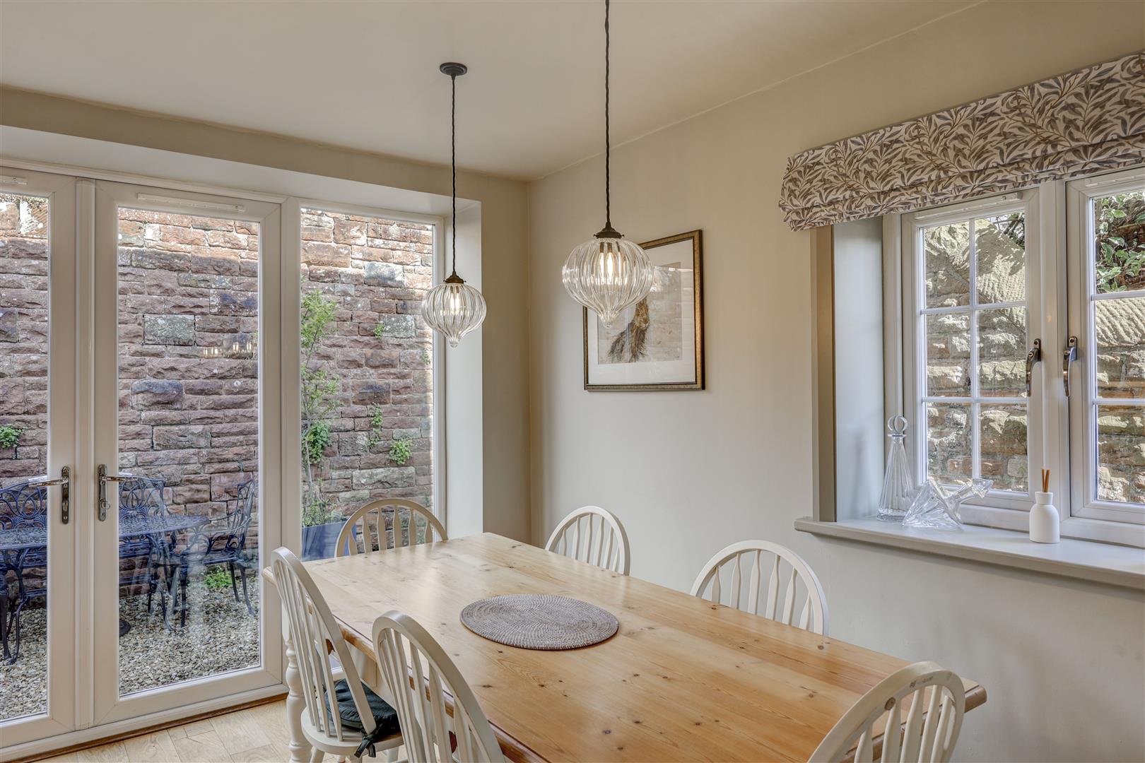 Integrated appliances include a double oven, induction hob, dishwasher, washer-dryer, and fridge/freezer — a complete specification that ensures the kitchen is ready for immediate use, whether as a primary home or holiday let. The open-plan dining area creates an inviting sociable space, ideal for entertaining guests with beautiful oak flooring, feature lighting from the renowned Jim Lawrence and doors out to the private rear seating area.