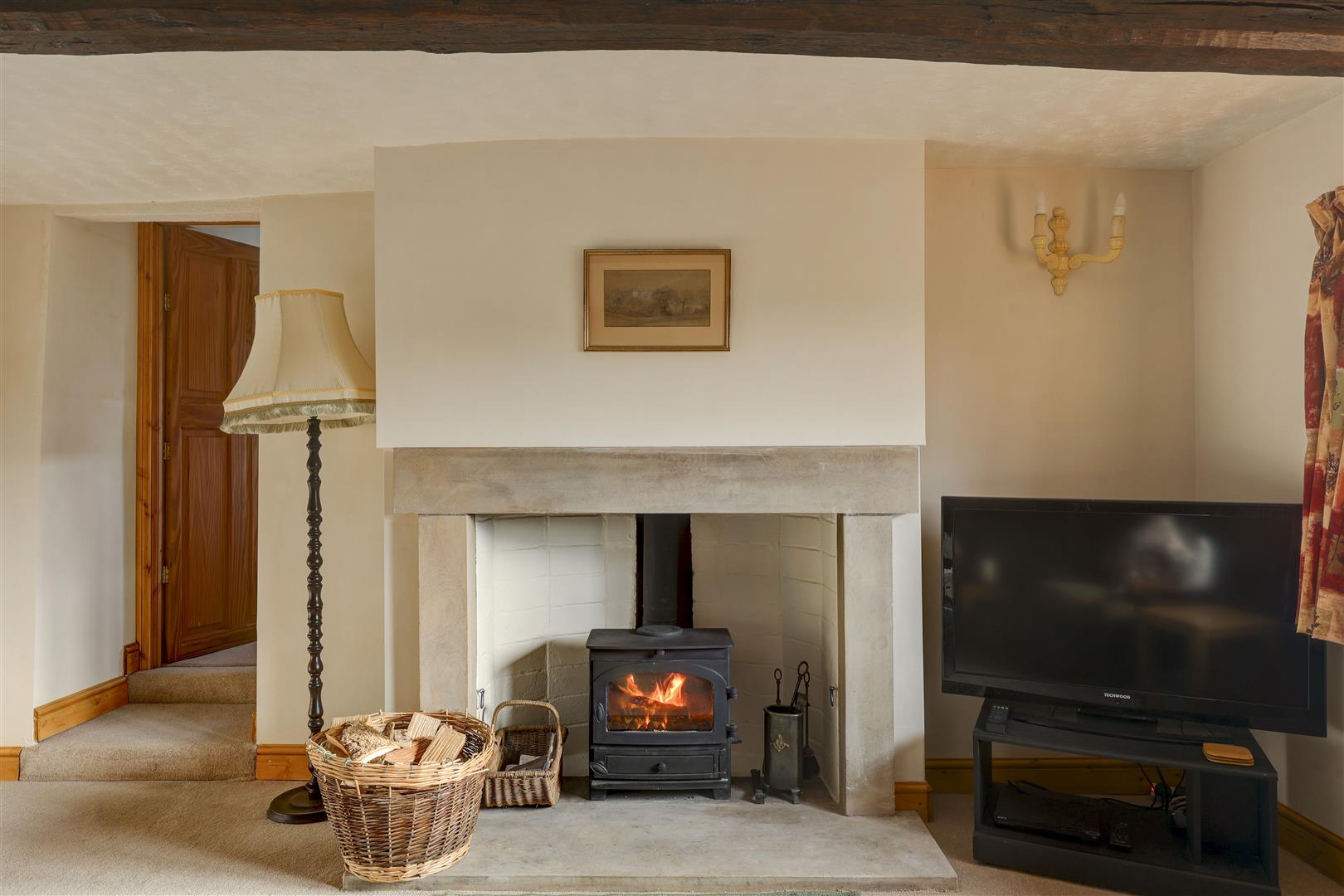 A spacious room with spectacular traditional features, including a vaulted ceiling with beams, stone walls, and a stunning fireplace with a multi-fuel stove. Enjoys views of the gardens and surrounding countryside.