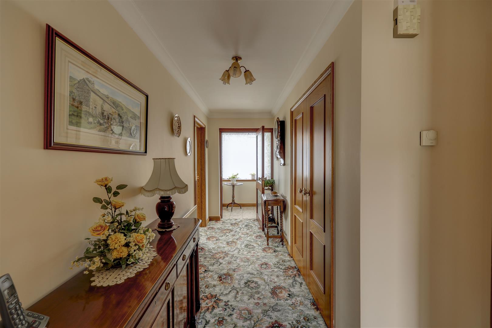 The entrance hallway has doors off to the accommodation. There are two large storage cupboards. Fitted carpet. Radiator. Ceiling hatch giving access to the loft space which is partially boarded and has a drop down ladder.
