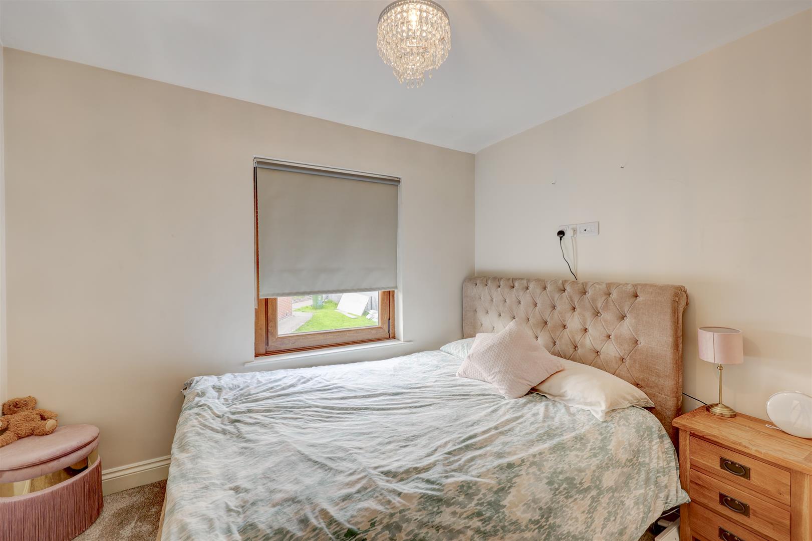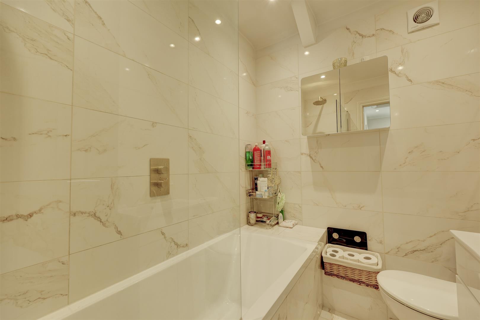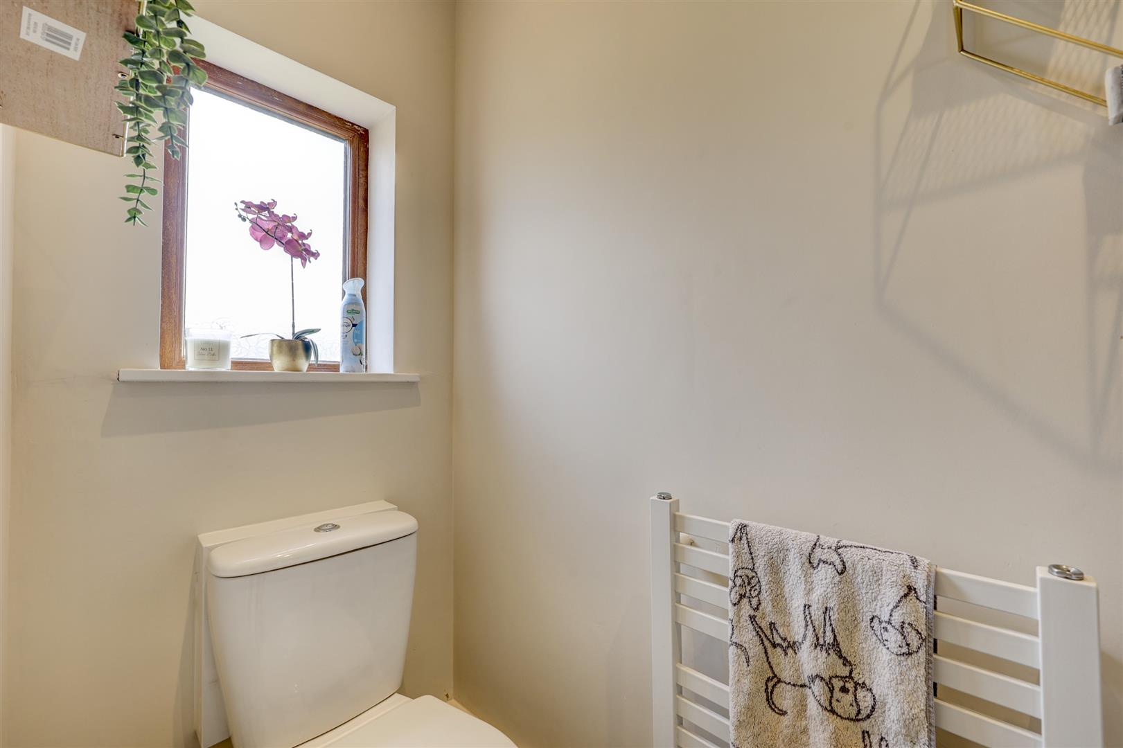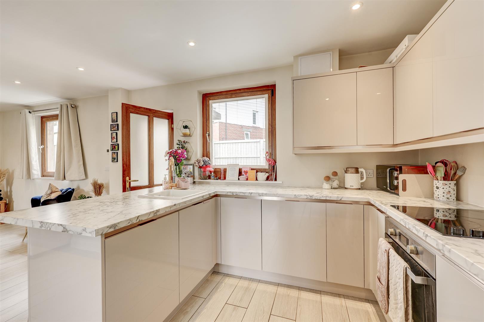 A modern kitchen which has a range of fitted wall and base units with complementing worksurfaces and a sink unit. There are a range of integrated appliances including a fridge freezer, dishwasher, washing machine, oven and induction hob. Two uPVC double glazed windows with fitted blinds. Open to the lounge / dining room. There is a uPVC door to the rear elevation giving access to the garden.